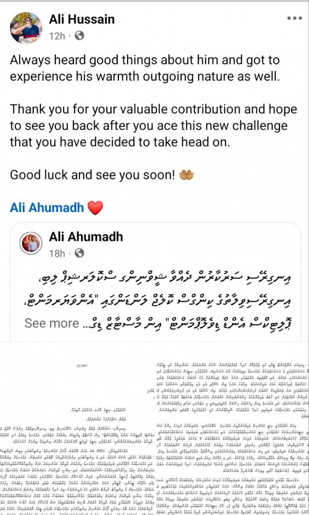 "ޑެޕިއުޓީ އަޅުގަނޑުމެންގެ ޓީމާ ވަކިވެވަޑައިގަތުމީ ފޫބައްދަން އުނދަގޫ، ފަޅުކަމެއް ލިބޭނެކަމެއް. އަބަދުވެސް ކުރައްވާ ކޮންމެކަމެއްގައިވެސް ކާމިޔާބަށް އެދެން." މެންބަރު އާތިފާ އަލީ ވިދާޅުވި އެވެ.