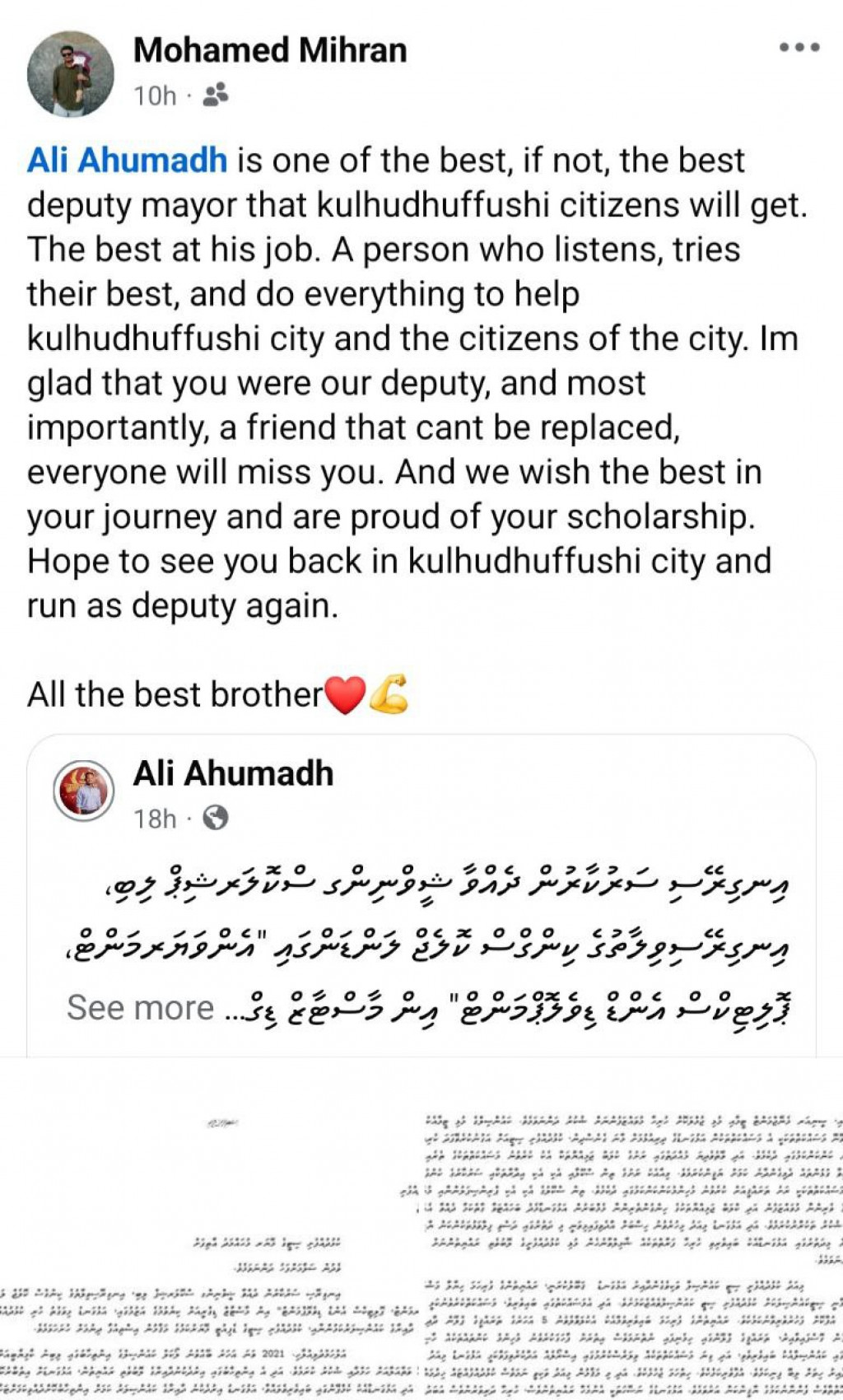 "މިސިޓީގެ ތަރައްޤީއަށް ކައުންސިލުން ކޮށްފައިވާ ކޮންމެ ކަމެއްގައިވެސް ޑެޕިއުޓީ މޭޔަރު އަލީ އަހުމަދުގެ ހިއްސާ އިންތިހާއަށް ބޮޑު، އެބޭފުޅާގެ ހިދުމަތްތައް އަބަދުވެސް ރަށްވެހިންގެ ހިތުތަކުގައި ދެމިހުންނާނެކަން ޔަގީން،." މެންބަރު ރިލޭ ވިދާޅުވި އެވެ.