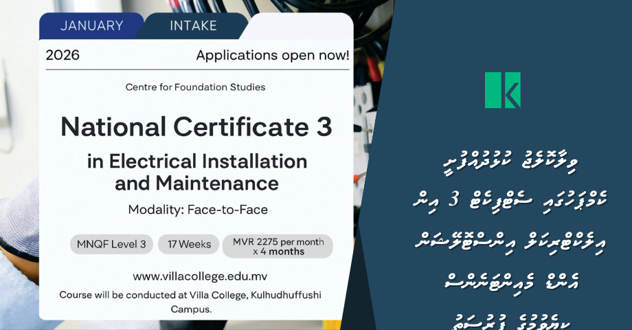 ކުރިއަށް އޮތް ޖެނުއަރީ އިންޓޭކުގައި، ވިލާކޮލެޖު ކުޅުދުއްފުށީ ކެމްޕަހުގައި ނޭޝަނަލް ސެޓްފިކެޓް 3 އިން އިލެކްޓްރިކަލް އިންސްޓޮލޭޝަން އެންޑް މެއިންޓަނެންސް ކިޔެވުމުގެ ފުރުސަތު ހުޅުވާލައިފި އެވެ.