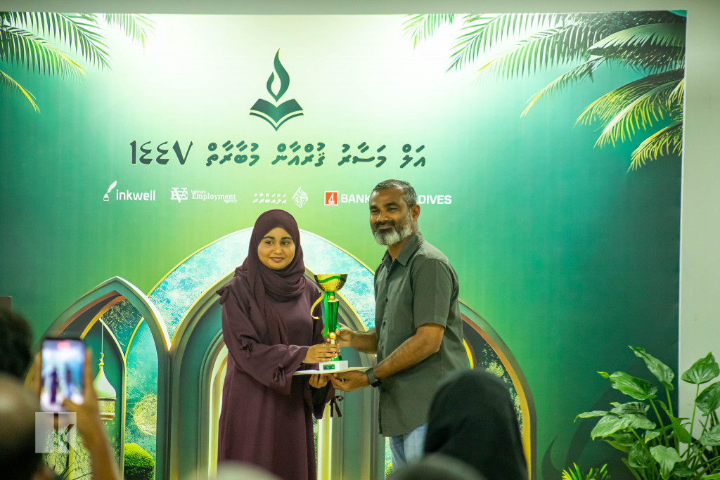މުޅި މުބާރާތުން ދެވަނަ ހާސިލުކުރީ ޔަމަކް ފަތުޙުﷲ ހަސަނެވެ. އަދި ތިންވަނަ ހޯދީ ކައިފް އަބުދުﷲ ހަމީދެވެ. ދެވަނަ ހޯދި ދަރިވަރަށް ޓްރޮފީ އާއި ސެޓްފިކެޓްގެ އިތުރުން 4000 ރުފިޔާގެ ފައިސާގެ އިނާމެއް ލިބުނުއިރު ތިންވަނަ ހާސިލުކުރި ދަރިވަރަށް 3000 ރުފިޔާގެ ފައިސާގެ އިނާމާއި ޓްރޮފީ އާއި ސެޓްފިކެޓް ދިނެވެ.