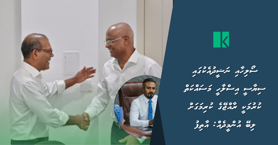 ރައީސް ސޯލިހާއި ރައީސް ނަޝީދު ބައްދަލުކުރި ފޮޓޯއެއް ޝެއާކުރައްވައި، އާތިފު ވިދާޅުވީ، އެއީ އުފާވެރި މަންޒަރެއް ކަމަށާއި ރާއްޖޭގެ ޤާނޫނު އަސާސީގެ ރޫހު ގެއްލި ޑިމޮކްރެޓިކް އަސާސްތައް ދަނީ ނެތި، އިޤްތިސާދު މެނޭޖް ނުކުރެވި ރައްޔިތުންގެ އާންމު ދިރިއުޅުން ދަނީ ދަތިވަމުން ކަމަށެވެ.
